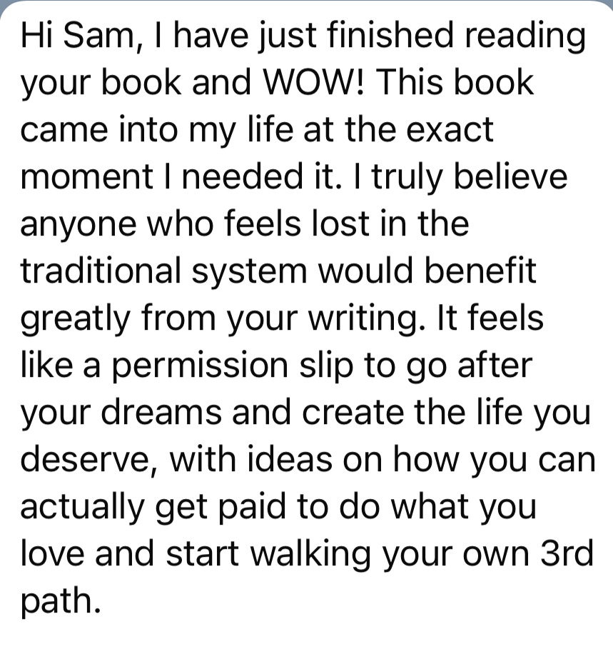 “This book came into my life at the exact moment I needed it. I truly believe anyone who feels lost in the traditional system would benefit greatly from your writing. It feels like a permission slip to go after your dreams and create the life you deserve."